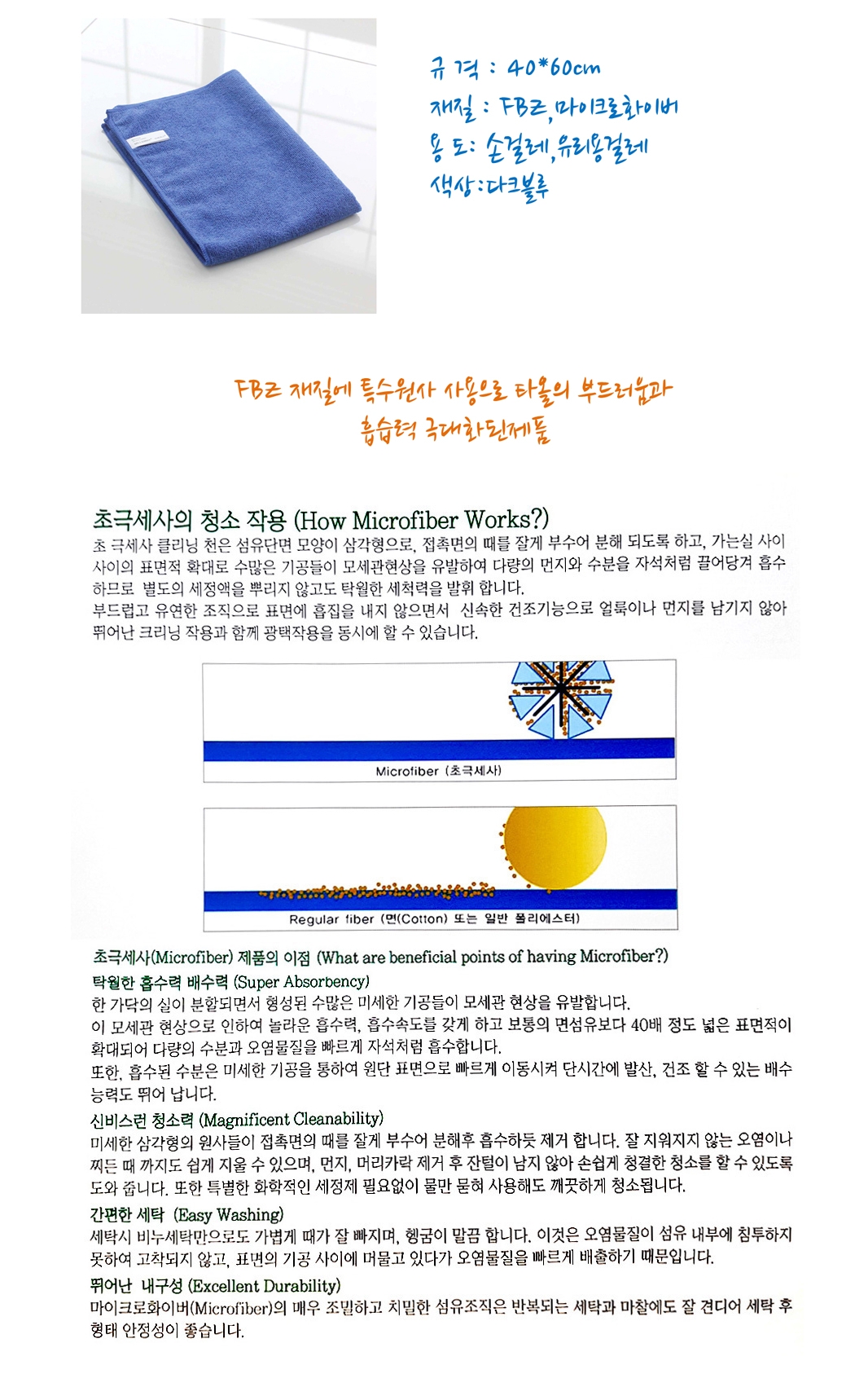 극세사타올 40X60cm 다크블루 세차타월 손걸레