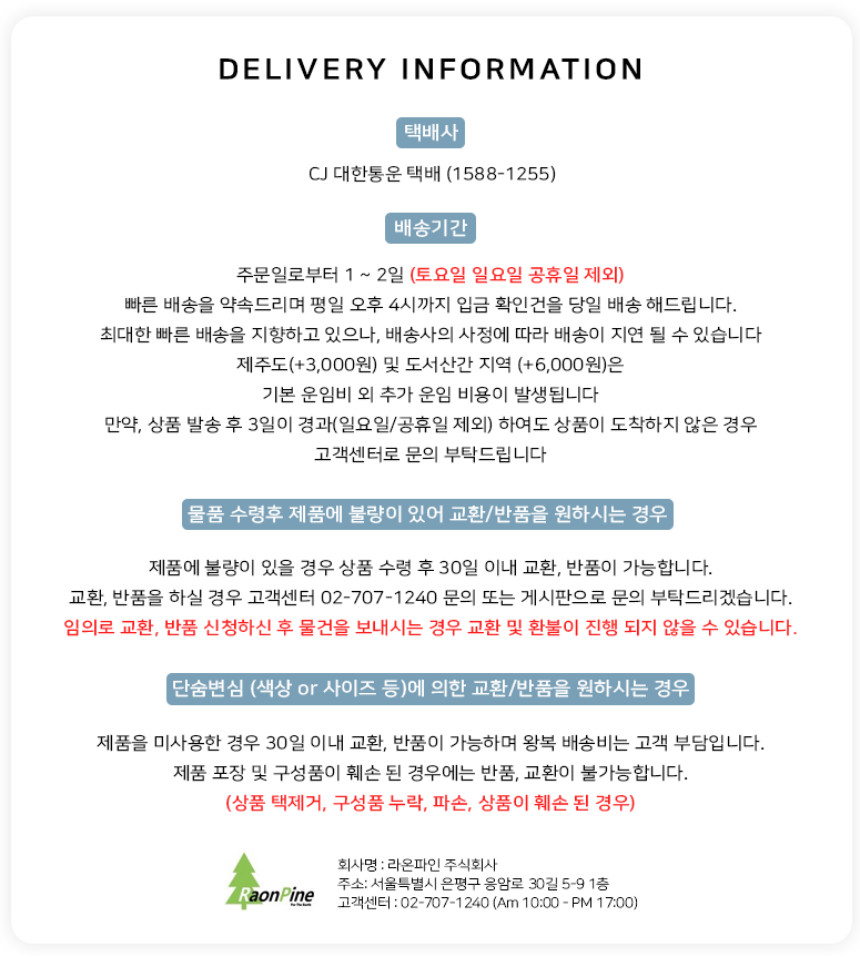 본 제품을 구매하시면 원활한 배송을 위해 꼭 필요한 고객님의 개인정보를 (성함, 주소, 전화번호 등) 택배사 및 제 3업체에서 이용하는 것에 동의하시는 것으로 간주됩니다.